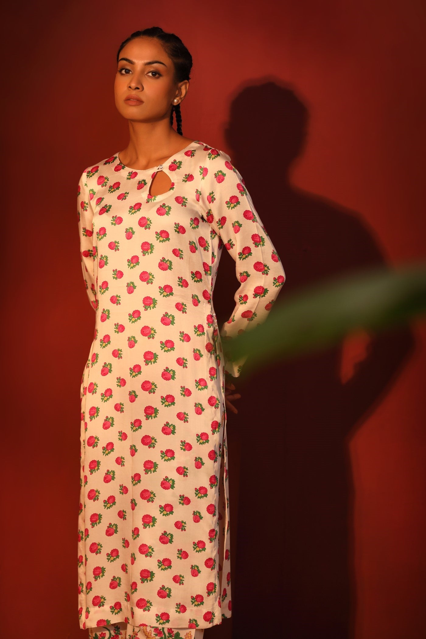 This ensemble is made in modal satin with floral digital print. It has a key hole neck with full sleeves. Lower has different print keeping the same colour palette as the kameez. Dupatta has same print as the palazzo. Kameez is adorned with crystal buttons.