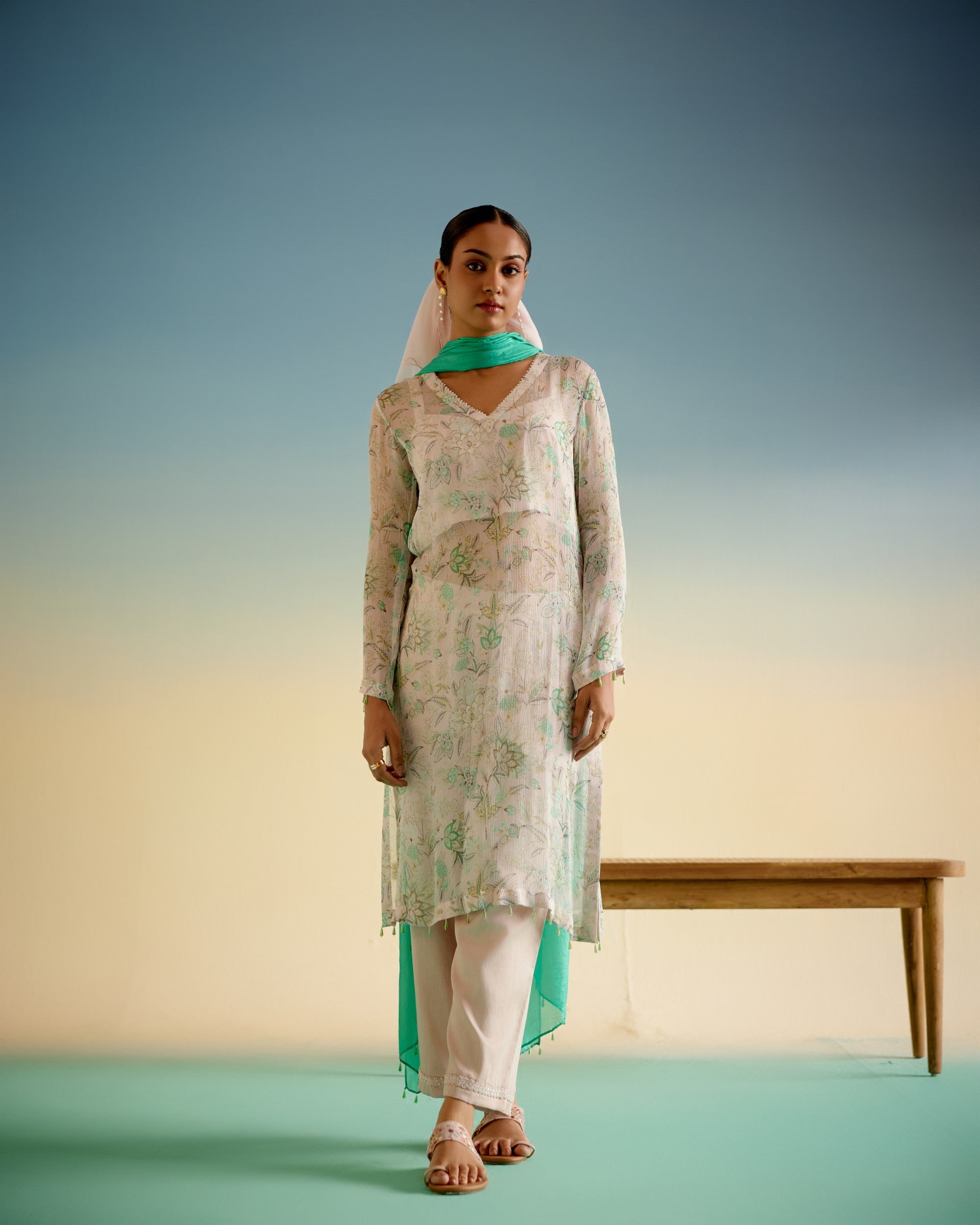 Straight fit digitally in-house printed kameez in pure chiffon with pants. Pants has hand embroidery on the bottom using beads. Dupatta pure silk with beads on the edges. Perfect wear to welcome spring!