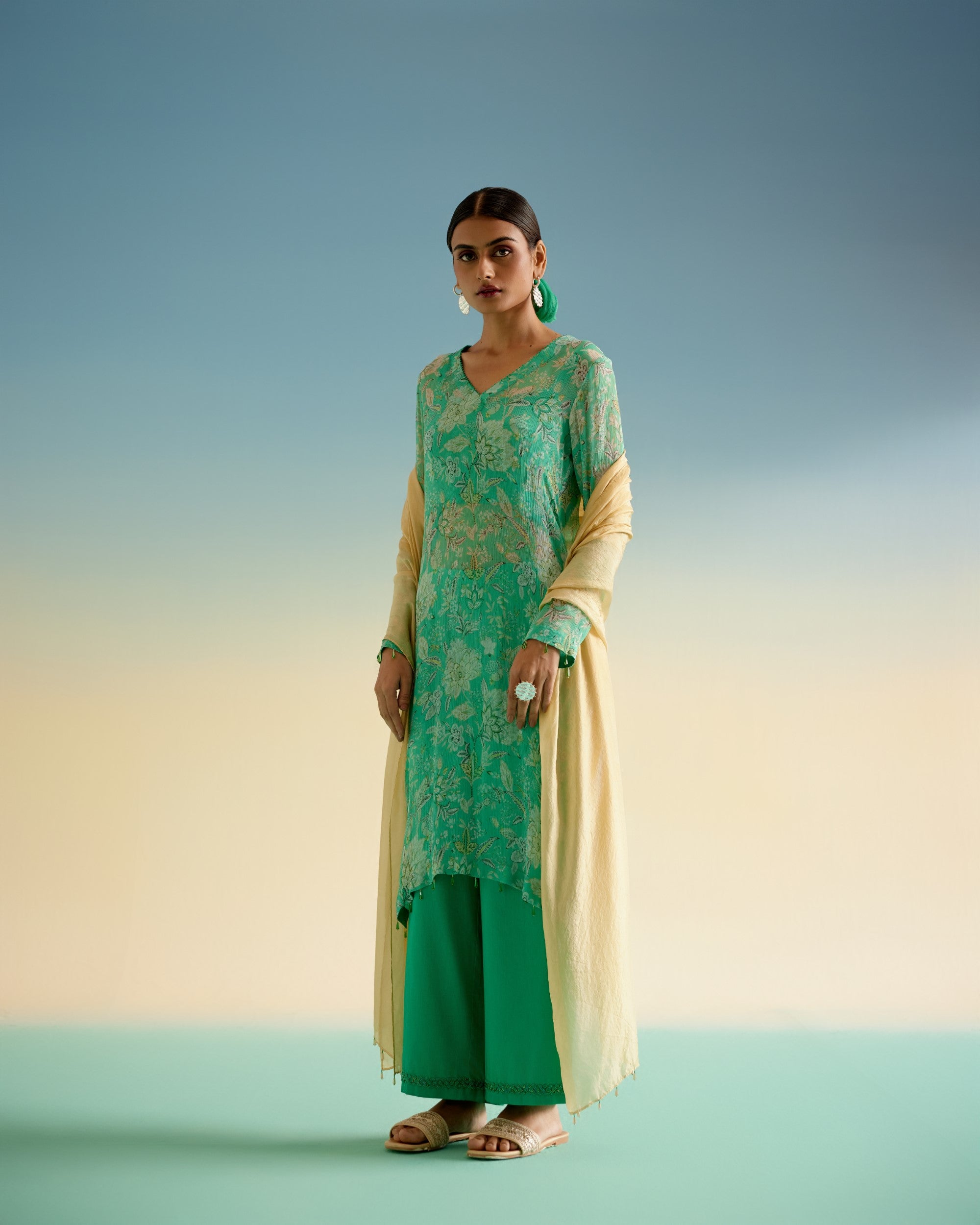 Straight fit digitally in-house printed kameez in pure chiffon with pants. Pants has hand embroidery on the bottom using beads. Dupatta pure silk with beads on the edges. Perfect wear to welcome spring!