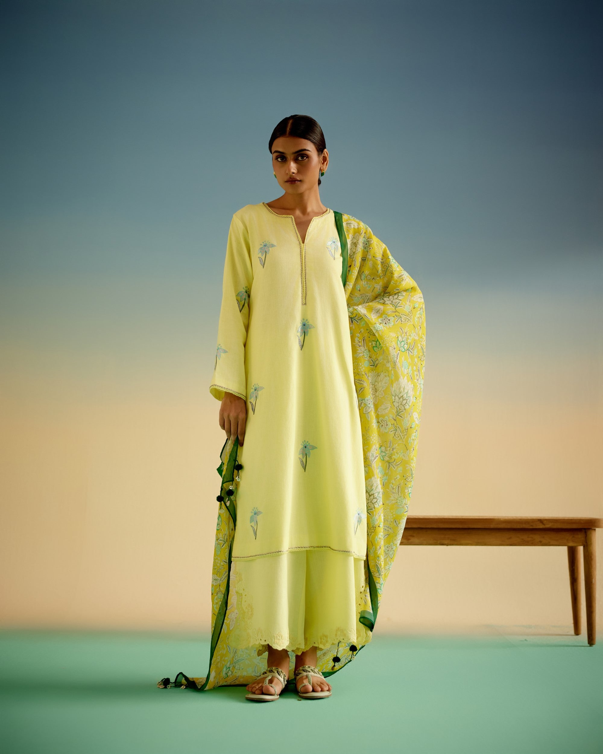 Comfortable fit kurta on cotton with machine embroidery all over. Lower in cotton with cutwork and tukri embroidery on the bottom. Dupatta digitally printed on organza. Perfect wear for day or evening gathering.