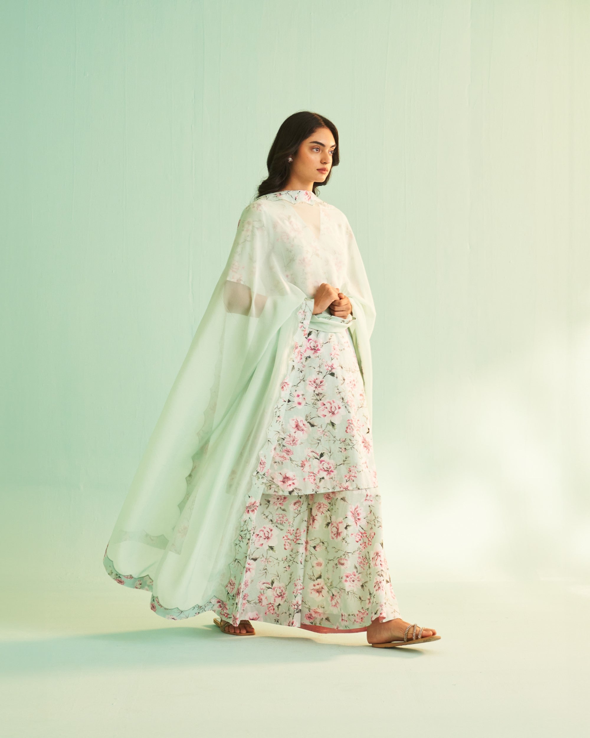 Straight fit floral digital print kurta on cotton linen with hand embroidery using sequins and beads highlighting the flowers. Lower: same print sharara. Dupatta: Solid colour viscose organza with print cutwork on all four sides.