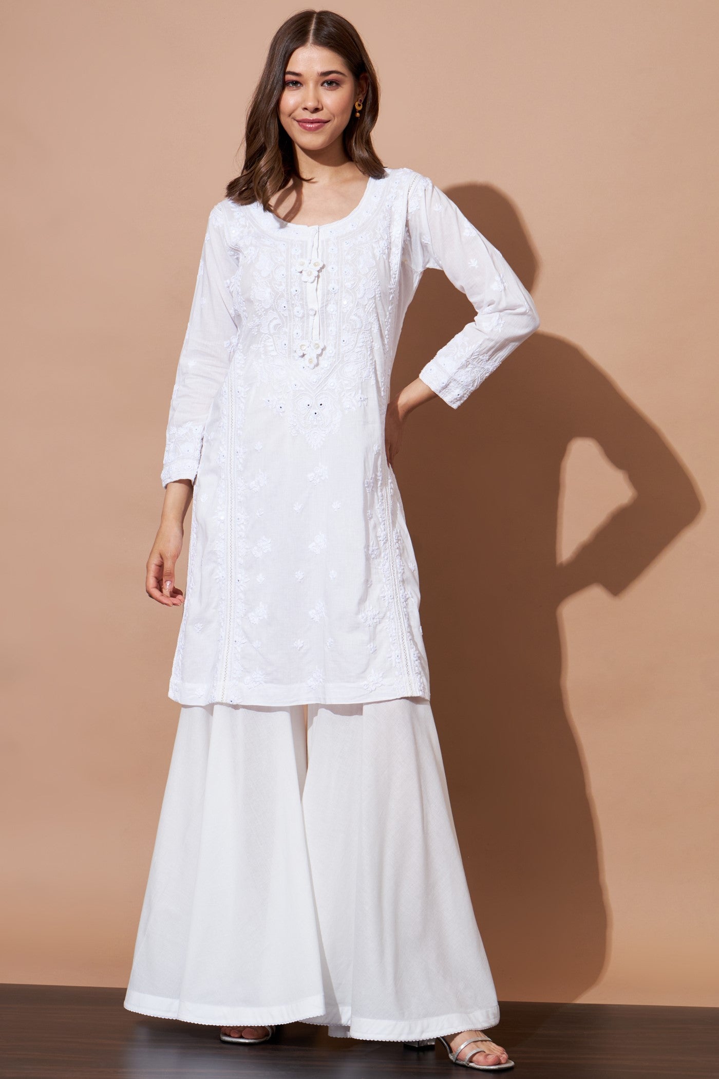 Delicate floral hand-embroidery with mirror work on the cotton, a must-have in your Spring/Summer wardrobe. Accessorise with fancy earrings, heels and your favourite white trousers or garara for a sophisticated look.