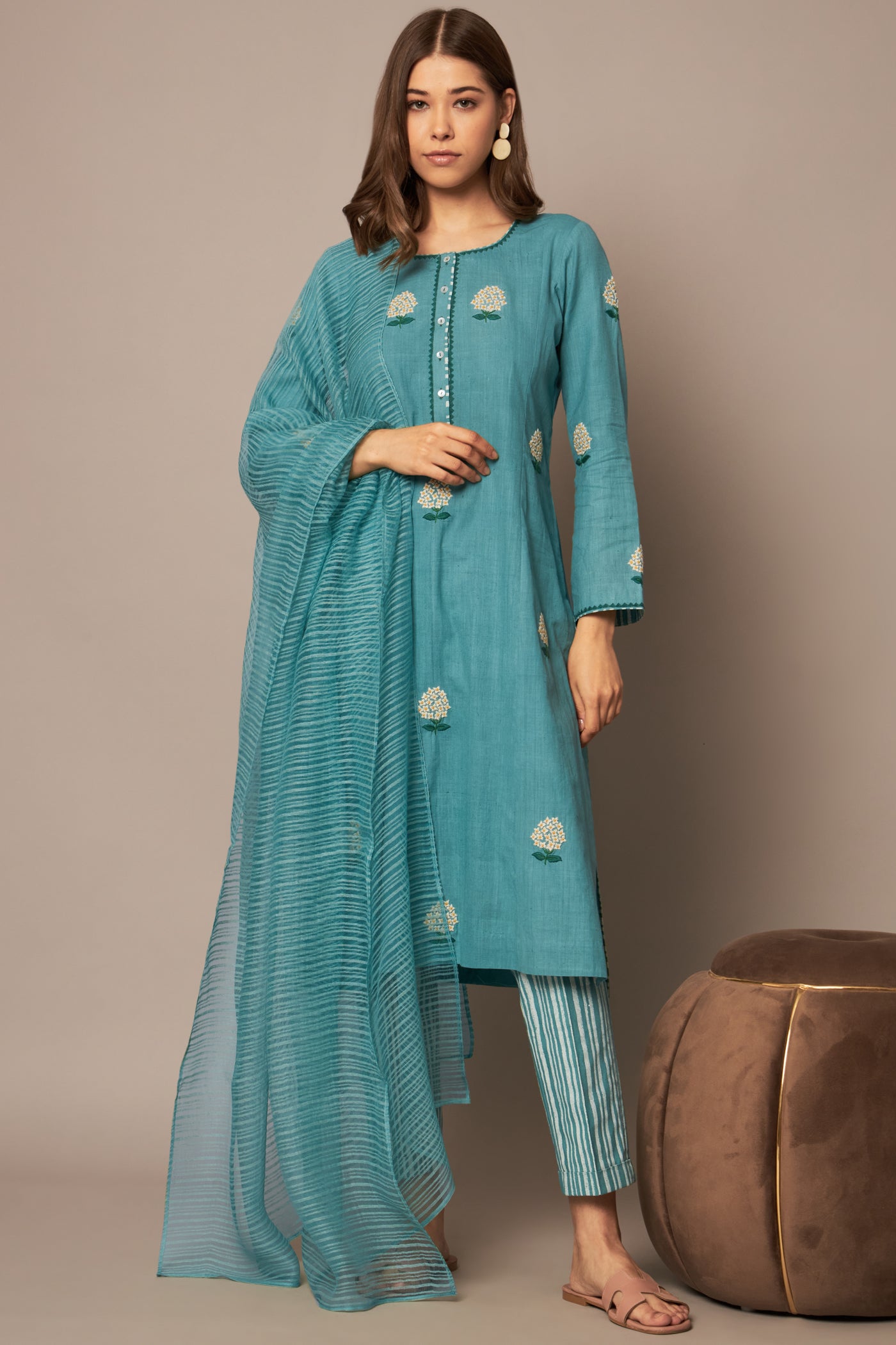Top: Hand woven Khaadi cotton with hand embroidered hydrangea flower bootis. Lower: Pure cotton straight pants with hand block printing. Dupatta: Hand woven fletcher cotton