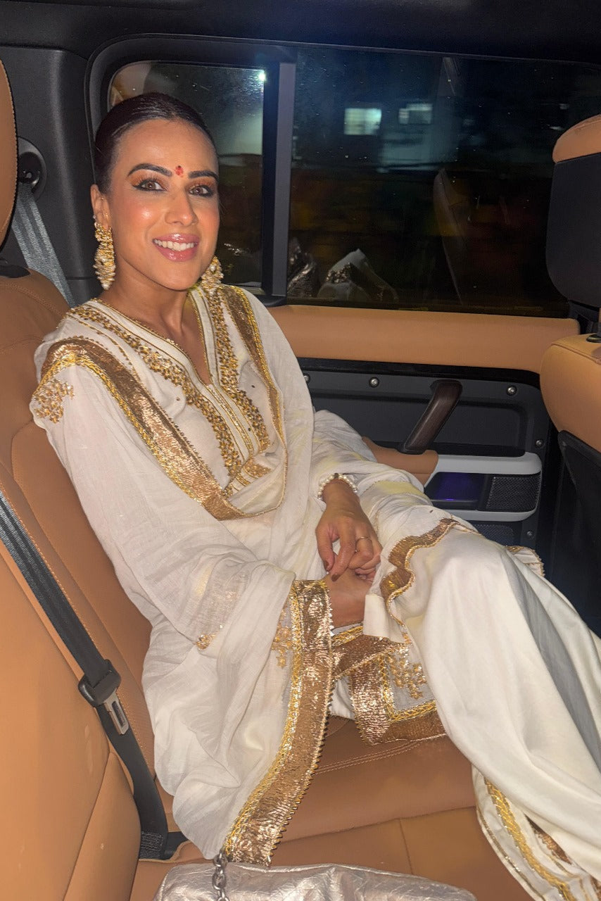 Heavily gota tikli embellished white kurta with mukaish all over paired with similar sharara and gota finished dupatta.