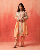 A graceful blend of tradition and subtle elegance, this peach kurta features delicate hand embroidery highlighted with fine contrast piping for a modern edge. Paired with straight-cut trousers and a matching dupatta, it’s perfect for festive gatherings or refined daywear.