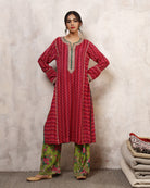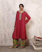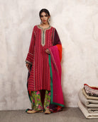 Red hot zigzags meet lush green florals – this print clash is a total showstopper! A kurta-farsi shalwar set that screams confidence, colour, and all things cool. This striking red kurta features bold zigzag patterns, beautifully accented with dori and sequin embroidery on the kurta and the lower. Paired with flowy green floral farsi shalwar, it brings together contrasting prints in a harmonious, playful way—perfect for adding a pop of color to your festive wardrobe.