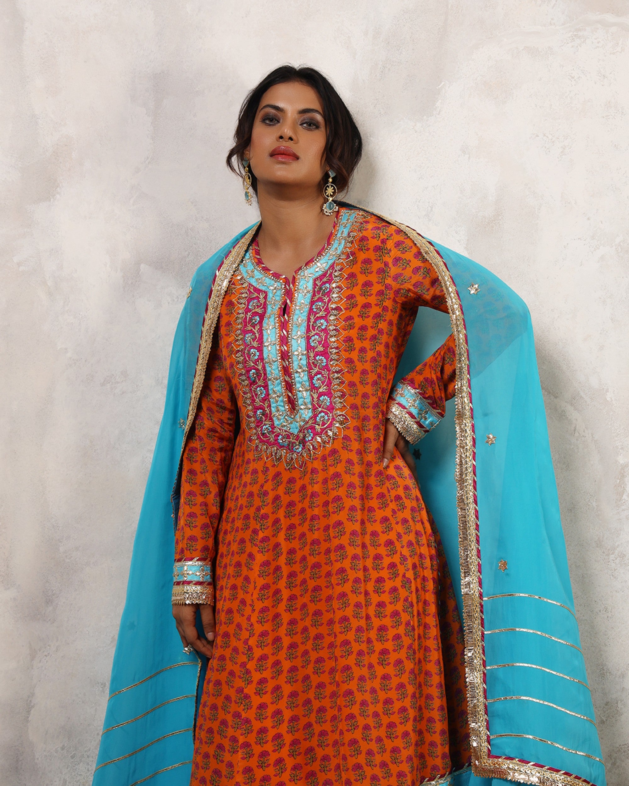 Radiating elegance in vibrant orange, this kameez crafted from crepe silk is paired with wide legged pants. The kameez features contrasting borders, gota lapas, and colorful maghzis along the hem, while the neckline is adorned with multi-colored pattis, intricate gota detailing, and zardozi embellishments. Golden gota kingrees add a royal touch, beautifully finishing the ensemble. The pants mirror the detailing with varying gota lapas, contrasting maghzis, and golden gota kingrees at the paincha. This outfit is a true celebration of heritage, bringing timeless artistry to life.