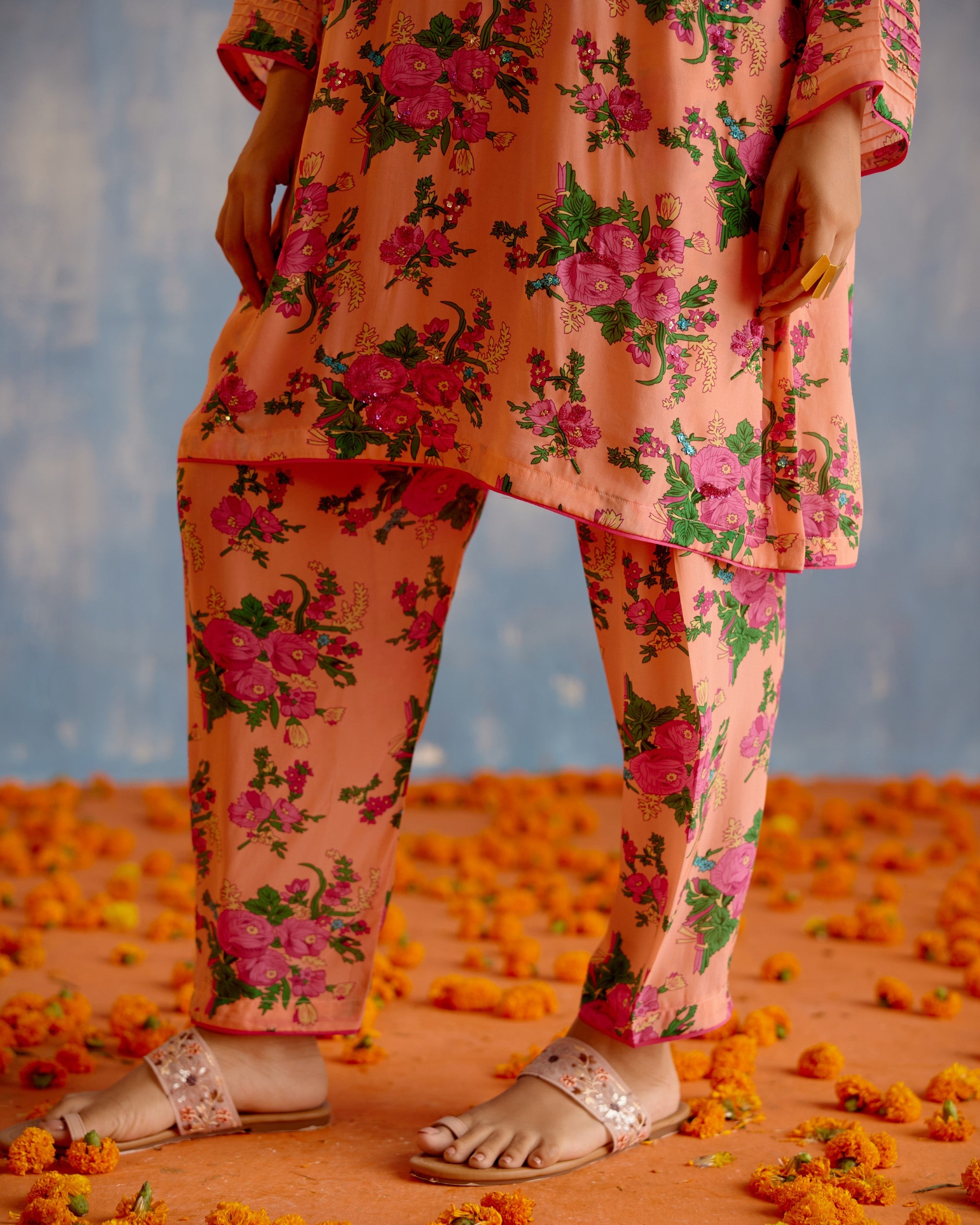 Short kurta with skinny shalwar on crepe. Kurta has hand embroidery using sequins and tiny glass beads highlighting the print.