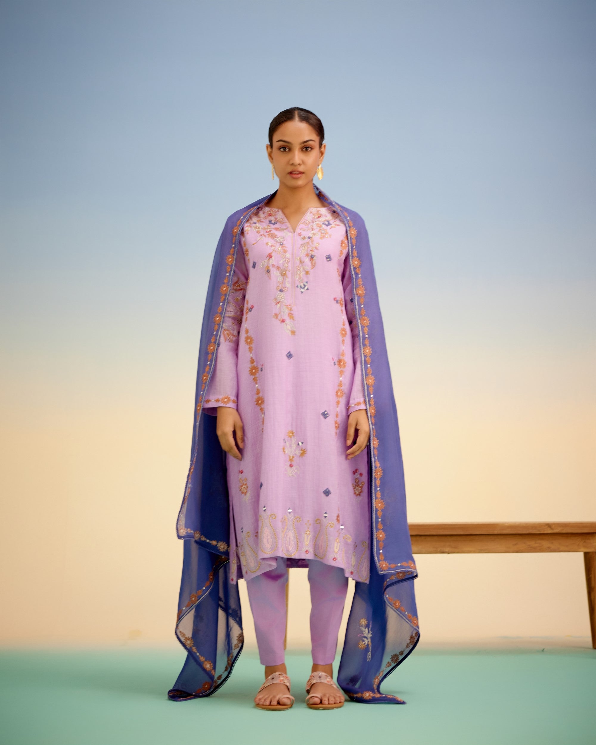 The statement  Gulaab kurta is a vision in a sunflower colour -blocked hue, encapsulated with stitches and multicolour machine and hand embroidery. Lower: Straight pants in viscose organza. Dupatta: contrasting colour on viscose organza with embroidery.