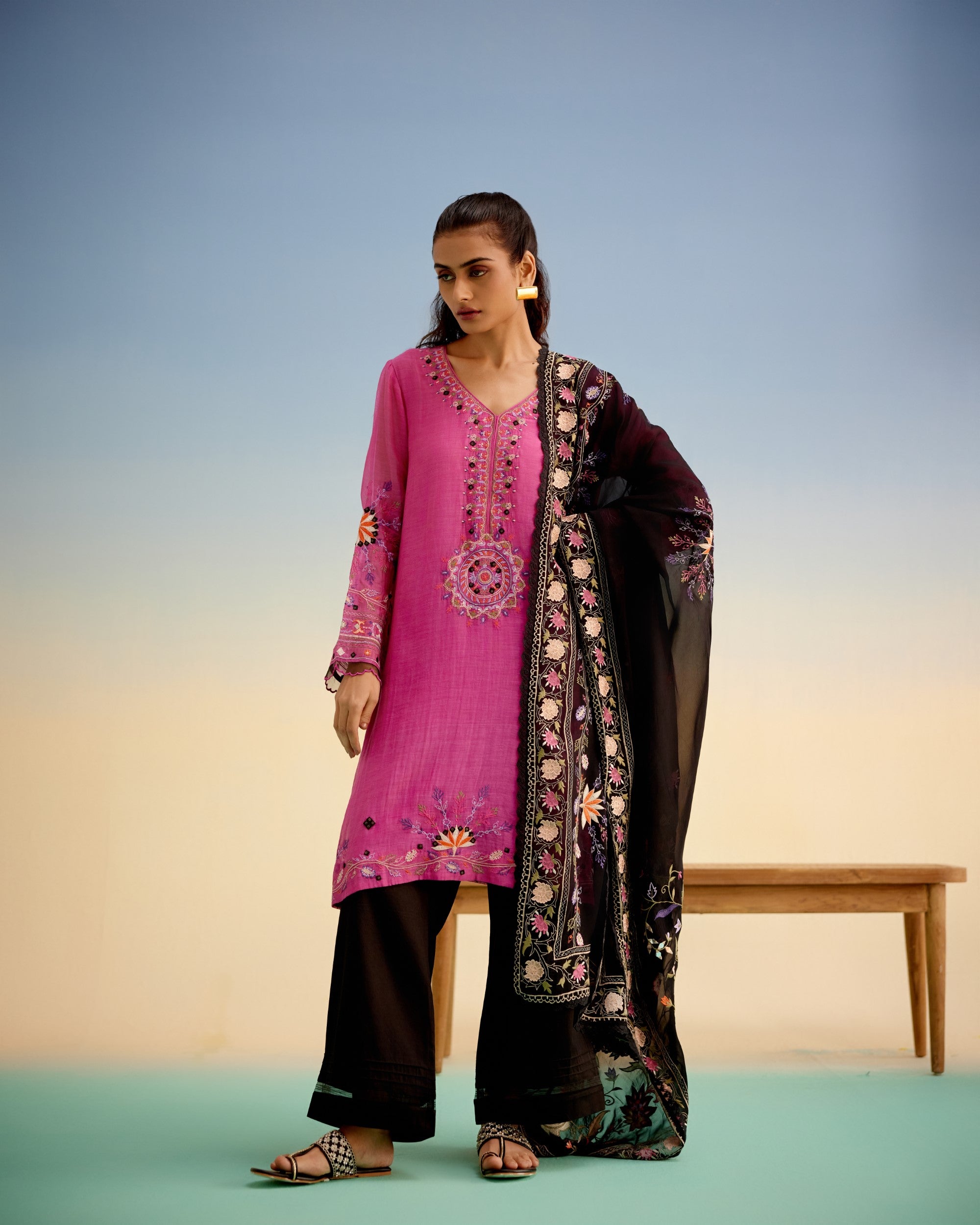 Zoya Fuchsia kameez on Mul chanderi is delightfully crafted with machine embroidery and applique accents all over and handcrafted tukri embroidery.Paired with black embroidered pants and fully embroidered dupatta on black viscose organza