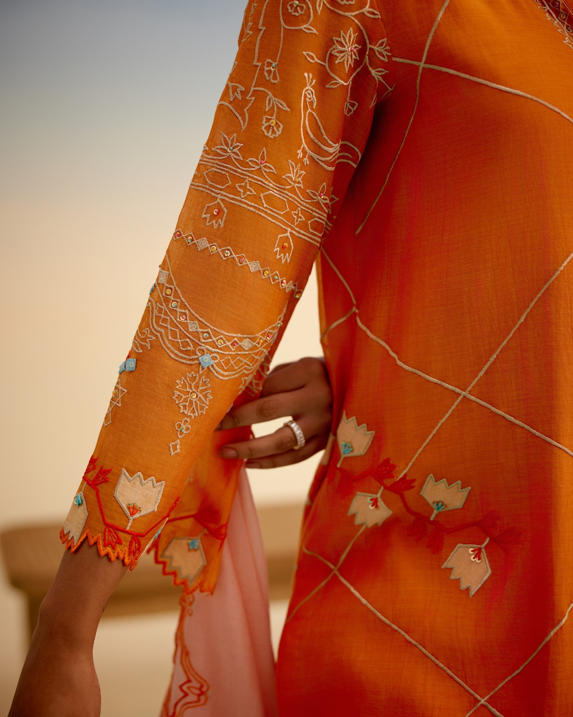 This Mul Chanderi kurta is adorned with multicolour thread embroidery and handcrafted with tukri embroidery. It is paired with off white lower in glaze cotton with embroidered patch work on organza at the bottom. Dupatta in mul chanderi fully embroidered.