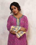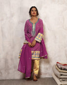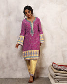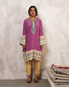 Embodying timeless elegance with a modern twist, this stunning outfit features a short pink kameez crafted from crepe silk, paired with a rich yellow shalwar. The kameez is adorned with contrasting patches, further highlighted with intricate gota work. The golden gota kingrees and contrasting color maghzis add a luxurious finish to the hem and sleeves, while the shalwar’s paincha echoes the exquisite detailing with golden gota lapas, maghzis, and kingrees. A perfect fusion of heritage and style, this ensemble celebrates tradition with unmatched grace.